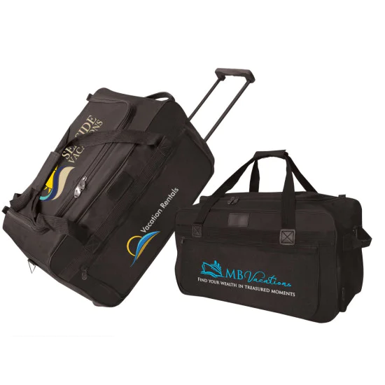 Rolling Duffel Bag. 600D Polyester with heavy vinyl backing. U-shaped Main Zippered Compartment. Large Zippered Front Pocket. Pull Handle. Dual Carry Handle with Handle Wrap. Shoulder Strap with Ruber Pad.