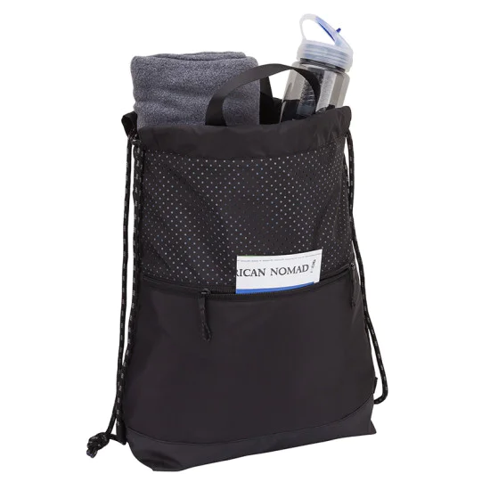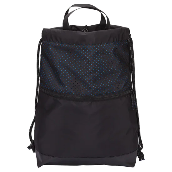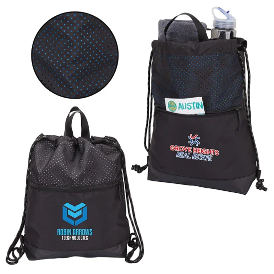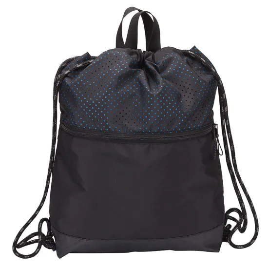The Adelanto drawstring bag combines style with functionality. Made of lightweight pongee polyester with water resistant TPU coated base and 210D lining, this bag has a perforated mesh design with stylish colored background underneath the front panel. The thick two-tone cord drawstrings double as backpack straps and the outside of the bag has a large zipper compartment. The magnetic button closure for the main compartment is flanked by two convenient carry handles.