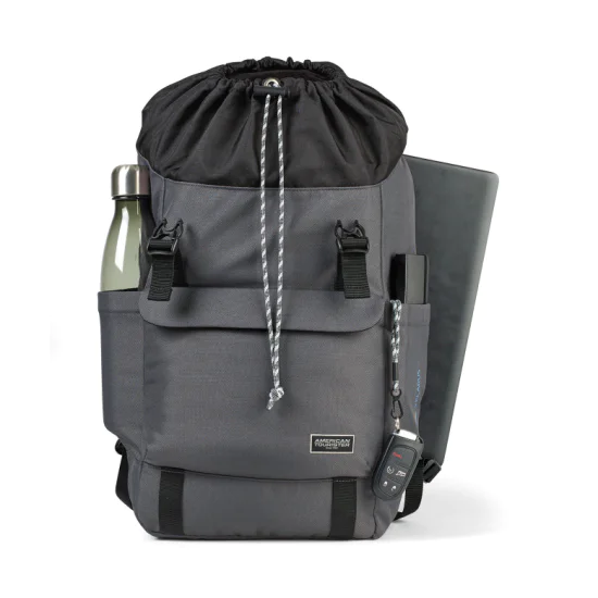 - Main compartment with drawstring opening and dual buckle closure to secure lid