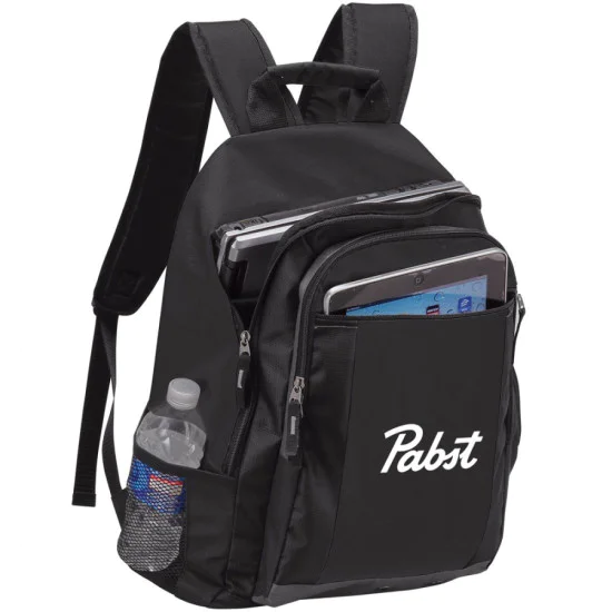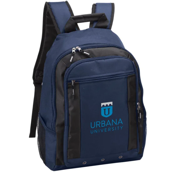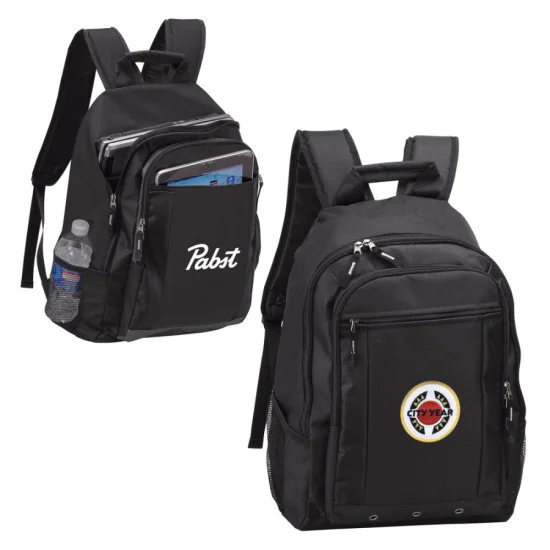This simple, but functional backpack is a great daily carry! Made of 600D polyester with Jacquard trim, this backpack has a fully padded front zipper pocket for a tablet. The main compartment also had a padded laptop sleeve for a 15.4” laptop. The front zip compartment contains pockets for stationery. Two mesh pockets on the sides allow you to carry water bottles.