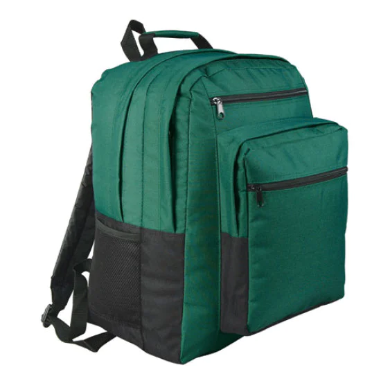 Two double zippered main compartments, zippered front pocket and two side mesh pockets
