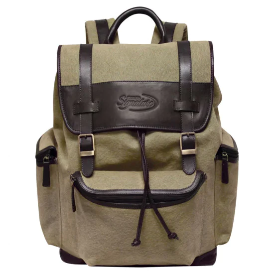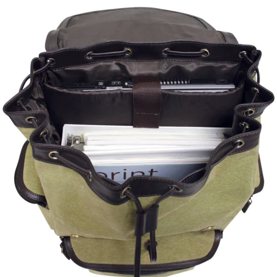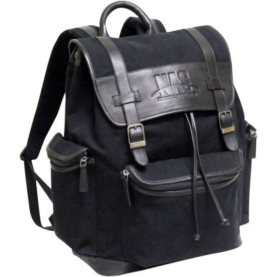 Done in rugged 20 oz canvas mixed with rich drum dyed nappa leather highlight this fashionable, European style backpack. The top has a flap over with buckle straps with magnetic buttons and a drawstring closure. Inside the main compartment there is a padded sleeve for a 15.4” laptop and a large zip pocket for valuables. Zipper pockets on the front and both gussets allow for storage for all small essentials. A soft leather carry handle and heavy duty backpack straps complete this awesome backpack.