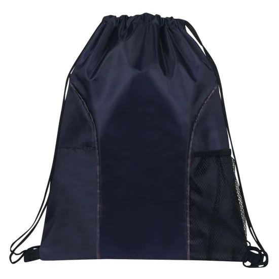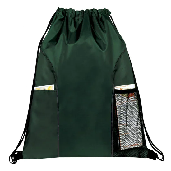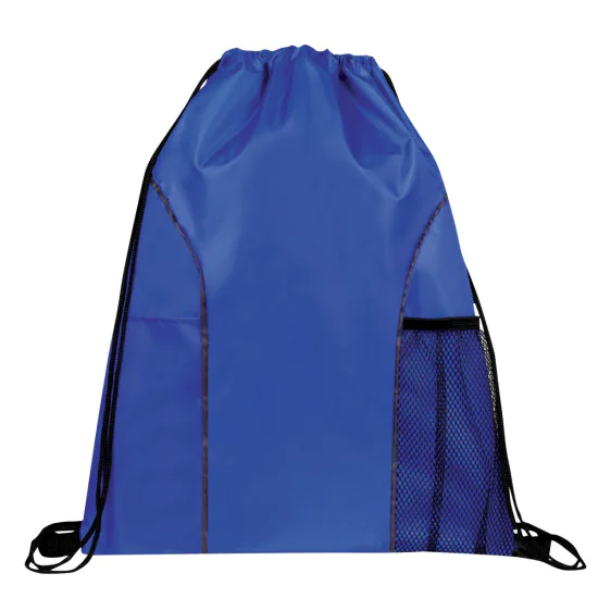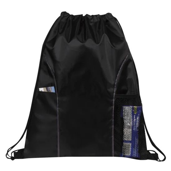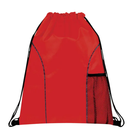 Open front pocket and mesh pocket for water bottle. Grey accent piping, 10 vibrant bag colors, tall imprint area.