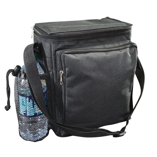 Zippered insulated compartment holds a 12 – 12 oz. cans, tall enough for 20 oz. bottles, large front zippered pocket, outside cell phone and mesh bottle pockets, adjustable shoulder strap