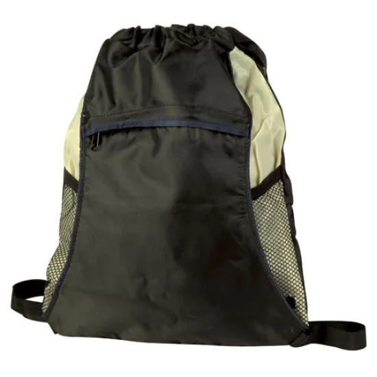 Nylon tote with front zippered pocket, two mesh easy pockets and drawstring closure