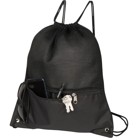 Drawstring bag with zippered front pocket.