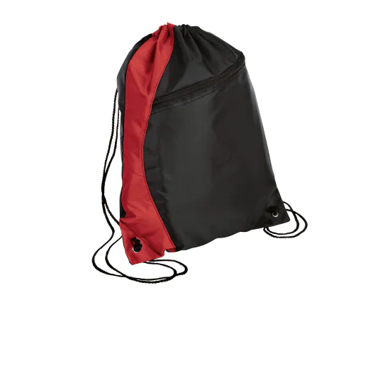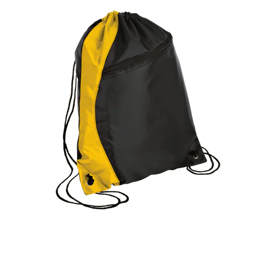 Color blocking and an asymmetrical zippered front pocket give this cinch pack distinctive character.