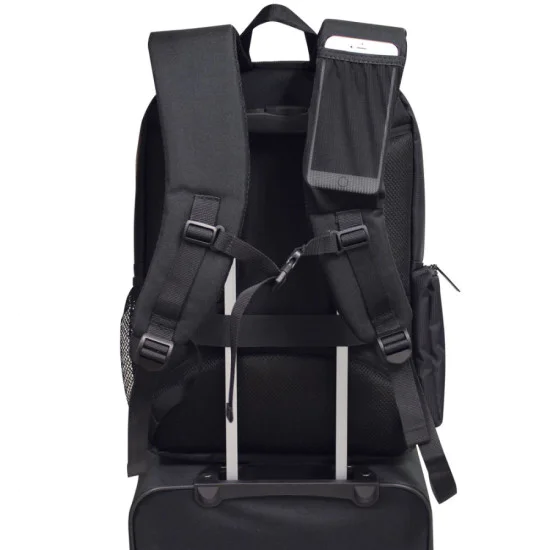 pocket for bottle. On the backpack strap there is an elastic mesh pocket, large enough to hold an iPhone 6 plus, to allow easy access to your phone while charging. There is a webbing strap that fits over a luggage handle and a chest buckle strap for easy transport. Made of 420D jacquard mixed with 1680D ballistic and 600D polyester. It works, guaranteed!