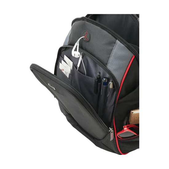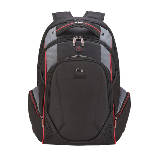 The fully-lined Solo Launch backpack is constructed from top-shelf materials. There is a padded zippered compartment that protects laptops up to 17.3”, a large main compartment with a padded tablet/ereader pocket, and a hard shell zippered front pocket with media pocket and an accessory organizer. The backside and straps are fully padded with air-mesh. The backpack also features stretch mesh easy access side pockets, two zippered side pockets, red accent trim, and a carry handle. Manufacturer provides 5 year limited warranty.