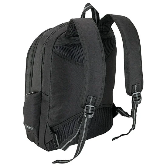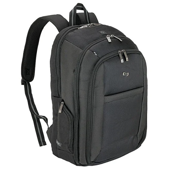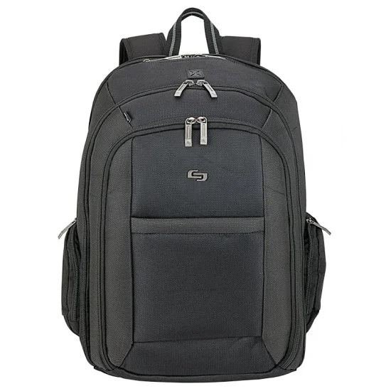 The Solo Metropolitan backpack is constructed from rugged 1680D polyester and 300D dobby materials. There is a zippered center compartment with a file divider and a padded section that will hold a 15.6″ laptop, zippered compartment with organizers and three pen loops and a fully-lined zippered front pocket. The ergonomic backside and straps are fully padded with air-mesh. The backpack also features a zippered valuables/media player pocket, two zippered side pockets and a carry handle.