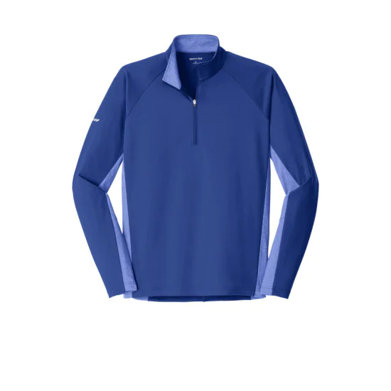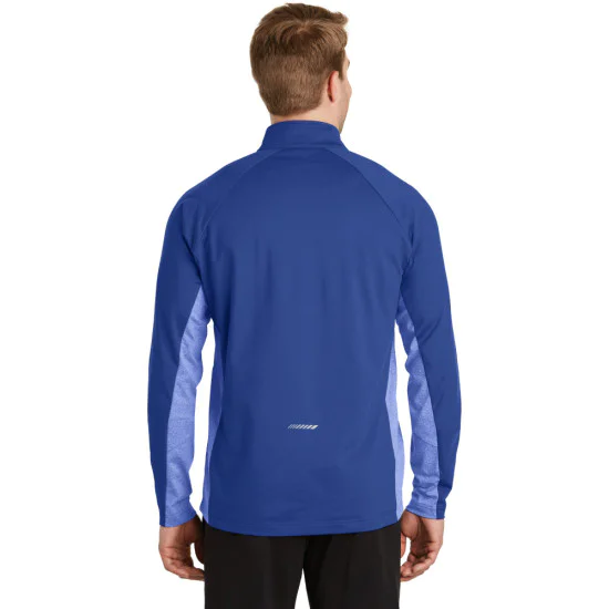 By mixing heather with a solid color and adding reflective hits, this moisture-wicking pullover has a technical look plus plenty of stretch for easy movement.