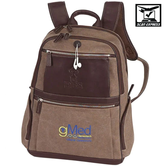 This rugged, stone-washed, 20 oz canvas backpack is trimmed with rich Columbia leather and highlighted with a creamy stitch.It’s durable material is made to withstand heavy daily use. The TSA-friendly padded sleeve in the rear compartment holds up to a 17” computer, and a piggyback sleeve holds an iPad or tablet. A spacious main compartment in the middle for other work loads. At the bottom front pocket, it contains pockets for business accessories, and at the top, there’s a media pocket. The fashion aluminum zippers in front panel make the case pop. Dual zip pockets on the side, a soft-grip leather handle, and a leather back strap complete this stunning piece.