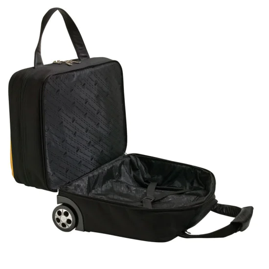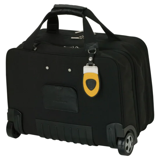 Vibrant yellow and black nylon and neoprene, main body with document compartment, accordion pocket, and garment bag, soft leather handles, convenient ID window on rear, hideaway trolley handle extends to 28″, matching luggage tag with Lamborghini emblem included.